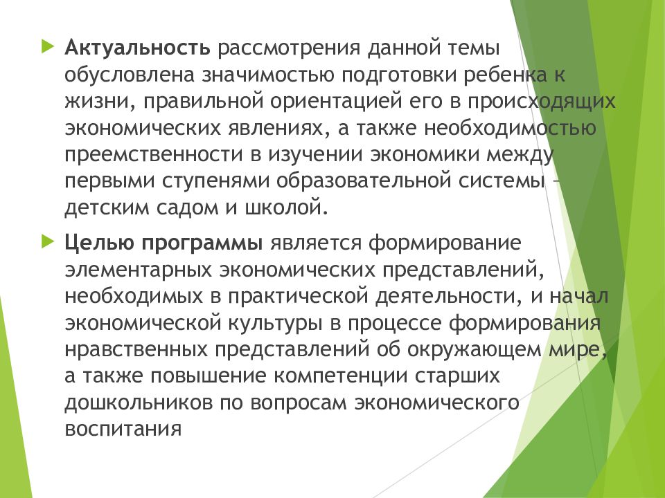 Актуальность рассмотрения данной темы обусловлена значимостью подготовки ребенка к жизни, правильной ориентацией его в происходящих экономических явлениях, а также необходимостью преемственности в изучении экономики между первыми ступенями образовательной системы – детским садом и школой. Целью программы является формирование элементарных экономических представлений, необходимых в практической деятельности, и начал экономической культуры в процессе формирования нравственных представлений об окружающем мире, а также повышение компетенции старших дошкольников по вопросам экономического воспитания
