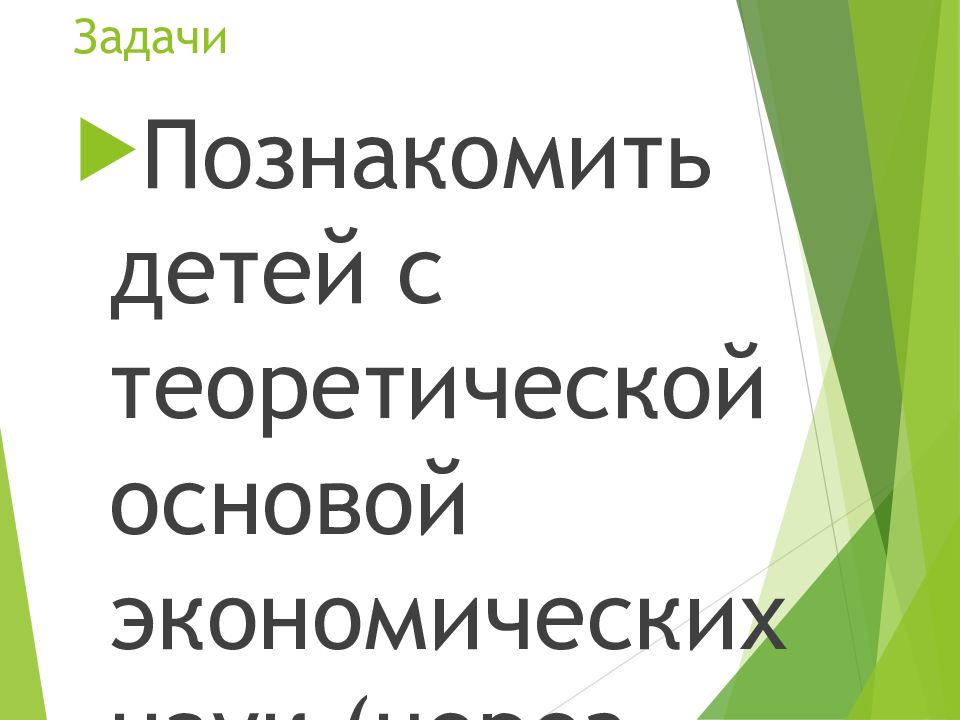 Познакомить детей с теоретической основой экономических наук (через ознакомление с наиболее доступными экономическими понятиями, знакомство с современными рыночными отношениями). Формировать умение применять экономические знания в конкретных условиях, элементарных экономических расчетах, рациональном использовании доступных материальных ценностей. Способствовать развитию умений соизмерять собственные потребности с материальными возможностями. Воспитывать навыки бережного отношения ко всем видам собственности, уважения интересов отдельной личности и других членов общества, привитие уважения к труду и людям труда. Познакомить детей со сложным миром предметов и вещей (как результата труда людей), человеческих взаимоотношений. Дать представления про взаимосвязь между этическими и экономическими категориями: деньги, труд, товар, цена, с одной стороны, и честность, щедрость, экономность — с другой. Познакомить с элементарными экономическими понятиями, со способами зарабатывания денег и разумной их трате. Пробуждать здоровый интерес к деньгам, учить бережному отношению с деньгами; Учить решать простейшие экономические задачи; Развивать логическое мышление, наблюдательность, пополнять активный словарный запас, умение делать умозаключения.