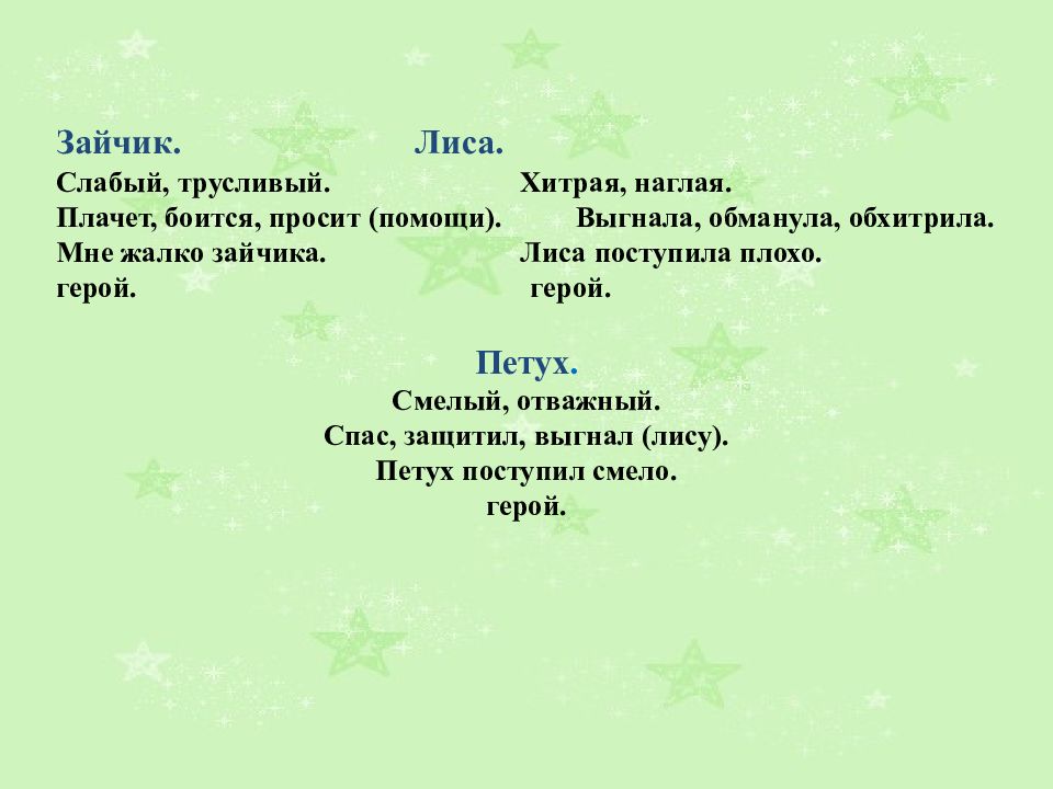 Зайчик. Лиса. Слабый, трусливый. Хитрая, наглая. Плачет, боится, просит (помощи). Выгнала, обманула, обхитрила. Мне жалко зайчика. Лиса поступила плохо. герой. герой. Петух. Смелый, отважный. Спас, защитил, выгнал (лису). Петух поступил смело. герой.