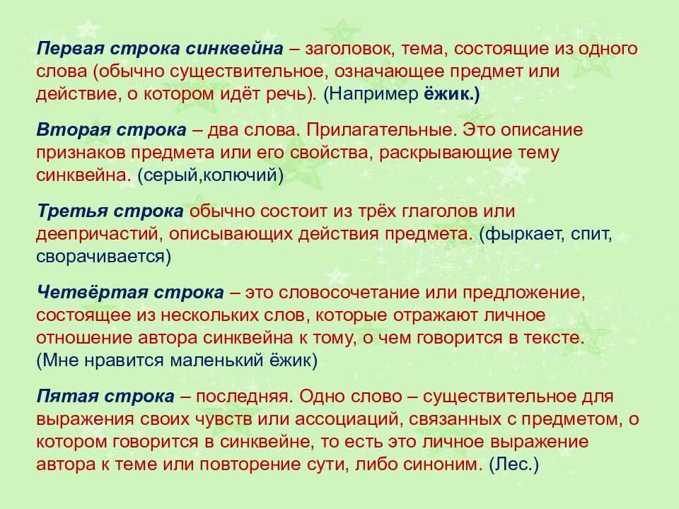 Первая строка синквейна – заголовок, тема, состоящие из одного слова (обычно существительное, означающее предмет или действие, о котором идёт речь). (Например ёжик.) Вторая строка – два слова. Прилагательные. Это описание признаков предмета или его свойства, раскрывающие тему синквейна. (серый,колючий) Третья строка обычно состоит из трёх глаголов или деепричастий, описывающих действия предмета. (фыркает, спит, сворачивается) Четвёртая строка – это словосочетание или предложение, состоящее из нескольких слов, которые отражают личное отношение автора синквейна к тому, о чем говорится в тексте. (Мне нравится маленький ёжик) Пятая строка – последняя. Одно слово – существительное для выражения своих чувств или ассоциаций, связанных с предметом, о котором говорится в синквейне, то есть это личное выражение автора к теме или повторение сути, либо синоним. (Лес.)