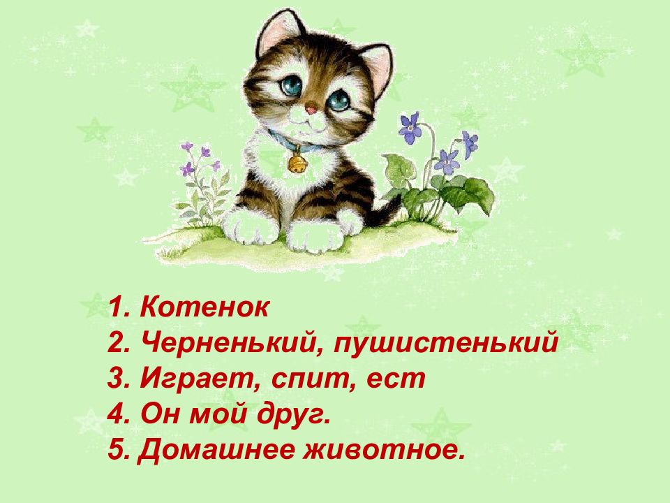 1. Котенок 2. Черненький, пушистенький 3. Играет, спит, ест 4. Он мой друг. 5. Домашнее животное.