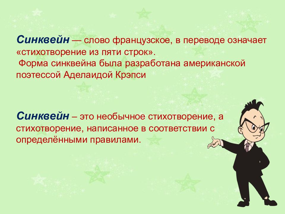 Синквейн — слово французское, в переводе означает «стихотворение из пяти строк». Форма синквейна была разработана американской поэтессой Аделаидой Крэпси Синквейн – это необычное стихотворение, а стихотворение, написанное в соответствии с определёнными правилами.