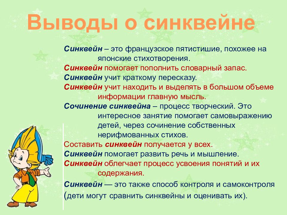 Синквейн – это французское пятистишие, похожее на японские стихотворения. Синквейн помогает пополнить словарный запас. Синквейн учит краткому пересказу. Синквейн учит находить и выделять в большом объеме информации главную мысль. Сочинение синквейна – процесс творческий. Это интересное занятие помогает самовыражению детей, через сочинение собственных нерифмованных стихов. Составить синквейн получается у всех. Синквейн помогает развить речь и мышление. Синквейн облегчает процесс усвоения понятий и их содержания. Синквейн — это также способ контроля и самоконтроля ( дети могут сравнить синквейны и оценивать их). Выводы о синквейне