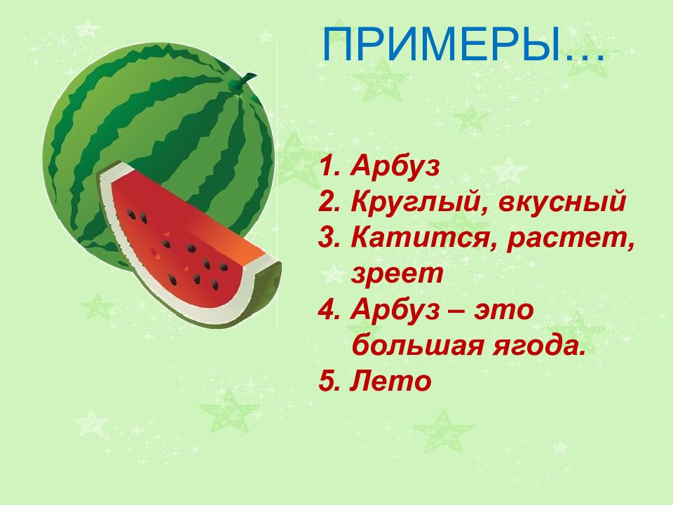 1. Арбуз 2. Круглый, вкусный 3. Катится, растет, зреет 4. Арбуз – это большая ягода. 5. Лето ПРИМЕРЫ…