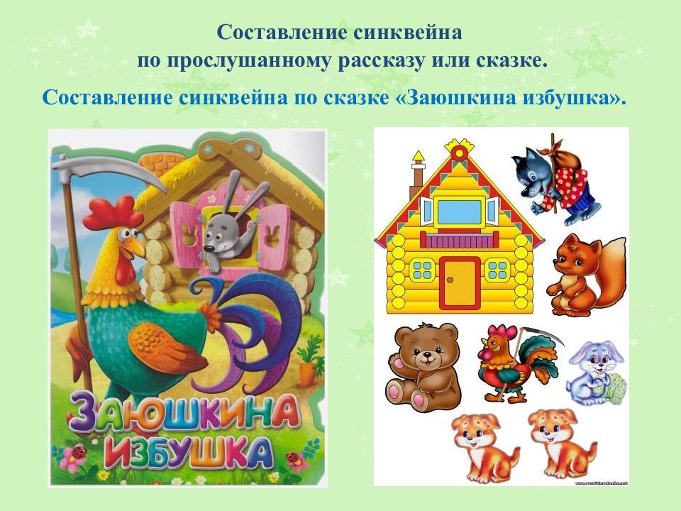 Составление синквейна по прослушанному рассказу или сказке. Составление синквейна по сказке «Заюшкина избушка».