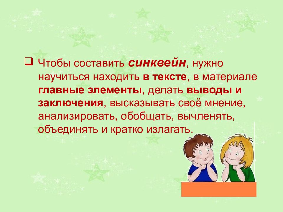 Чтобы составить синквейн, нужно научиться находить в тексте, в материале главные элементы, делать выводы и заключения, высказывать своё мнение, анализировать, обобщать, вычленять, объединять и кратко излагать.