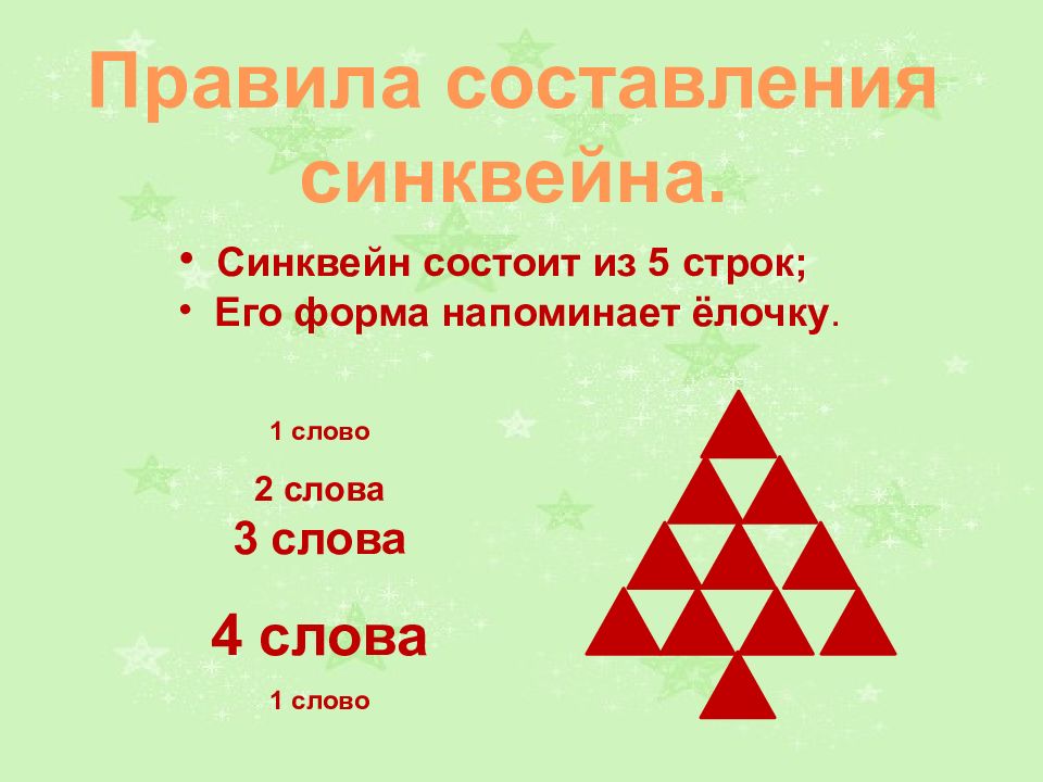 Синквейн состоит из 5 строк; Его форма напоминает ёлочку. 1 слово 2 слова 3 слова 4 слова 1 слово Правила составления синквейна.