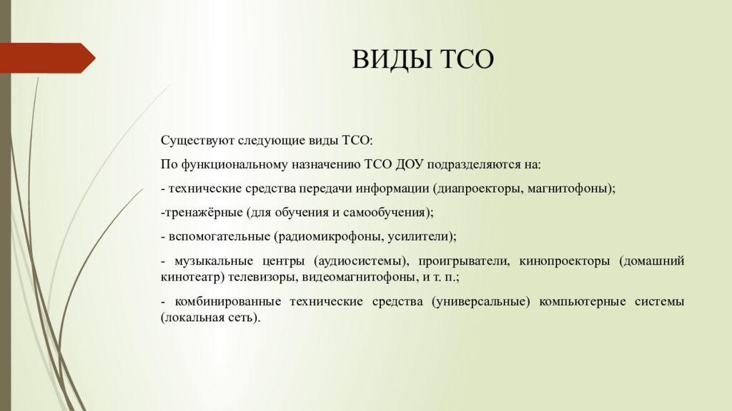 Существуют следующие виды ТСО: По функциональному назначению ТСО ДОУ подразделяются на: - технические средства передачи информации (диапроекторы, магнитофоны); -тренажёрные (для обучения и самообучения); - вспомогательные (радиомикрофоны, усилители); - музыкальные центры (аудиосистемы), проигрыватели, кинопроекторы (домашний кинотеатр) телевизоры, видеомагнитофоны, и т. п.; - комбинированные технические средства (универсальные) компьютерные системы (локальная сеть).