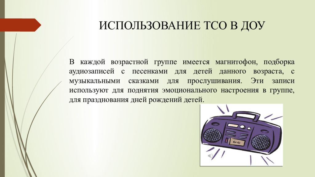 В каждой возрастной группе имеется магнитофон, подборка аудиозаписей с песенками для детей данного возраста, с музыкальными сказками для прослушивания. Эти записи используют для поднятия эмоционального настроения в группе, для празднования дней рождений детей.