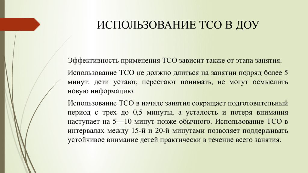 Эффективность применения ТСО зависит также от этапа занятия. Использование ТСО не должно длиться на занятии подряд более 5 минут: дети устают, перестают понимать, не могут осмыслить новую информацию. Использование ТСО в начале занятия сокращает подготовительный период с трех до 0,5 минуты, а усталость и потеря внимания наступает на 5—10 минут позже обычного. Использование ТСО в интервалах между 15-й и 20-й минутами позволяет поддерживать устойчивое внимание детей практически в течение всего занятия.