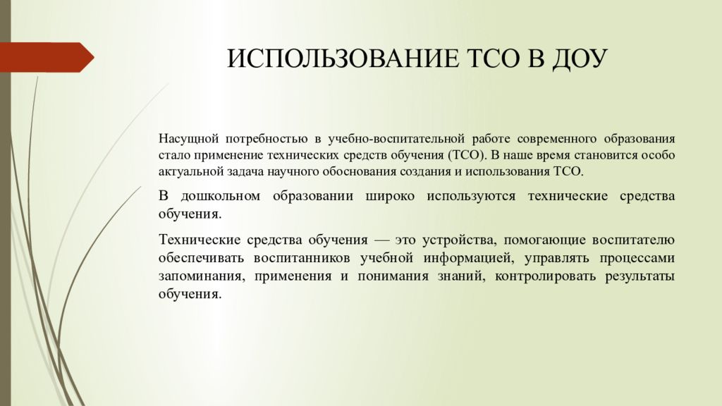 Насущной потребностью в учебно-воспитательной работе современного образования стало применение технических средств обучения (ТСО). В наше время становится особо актуальной задача научного обоснования создания и использования ТСО. В дошкольном образовании широко используются технические средства обучения. Технические средства обучения — это устройства, помогающие воспитателю обеспечивать воспитанников учебной информацией, управлять процессами запоминания, применения и понимания знаний, контролировать результаты обучения.