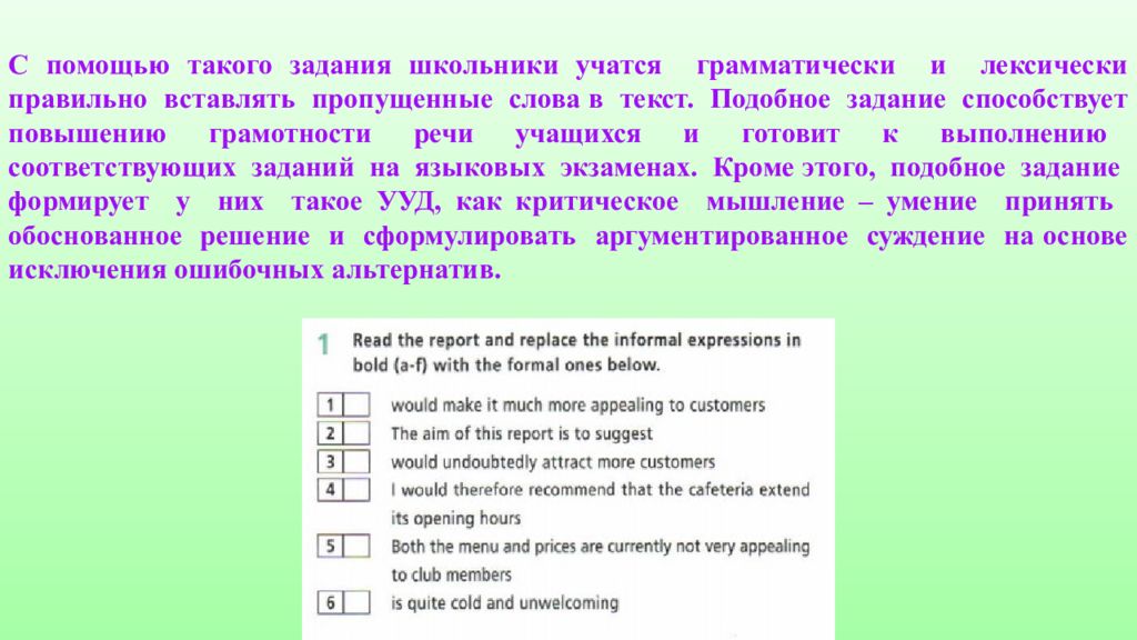 С помощью такого задания школьники учатся грамматически и лексически правильно вставлять пропущенные слова в текст. Подобное задание способствует повышению грамотности речи учащихся и готовит к выполнению соответствующих заданий на языковых экзаменах. Кроме этого, подобное задание формирует у них такое УУД, как критическое мышление – умение принять обоснованное решение и сформулировать аргументированное суждение на основе исключения ошибочных альтернатив.