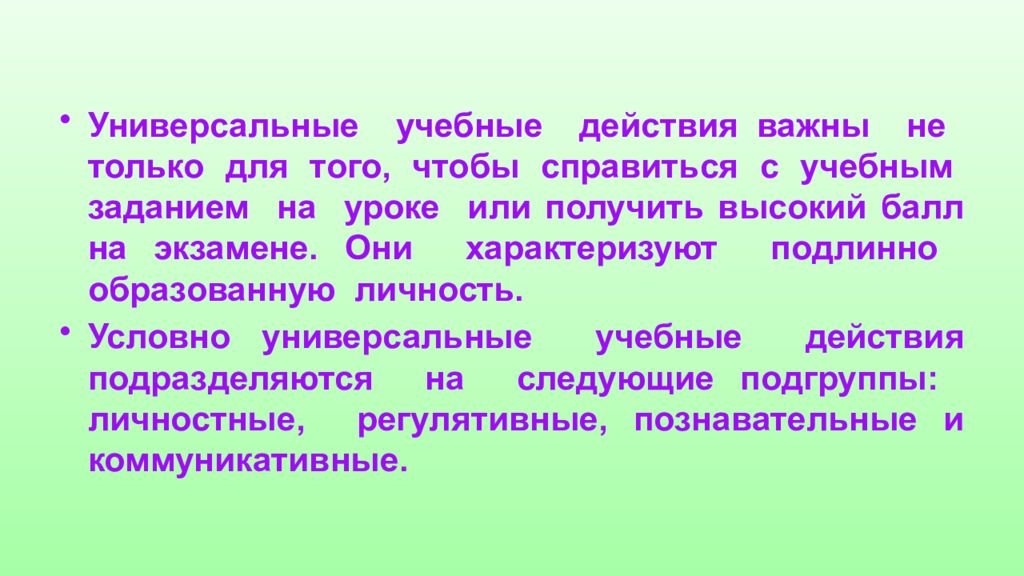 Универсальные учебные действия важны не только для того, чтобы справиться с учебным заданием на уроке или получить высокий балл на экзамене. Они характеризуют подлинно образованную личность. Условно универсальные учебные действия подразделяются на следующие подгруппы: личностные, регулятивные, познавательные и коммуникативные.
