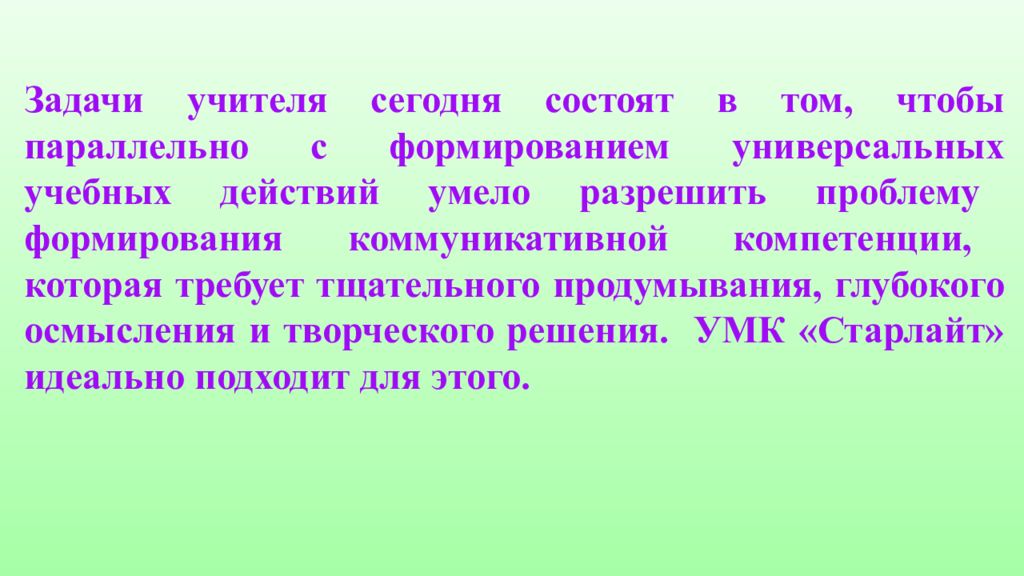 Задачи учителя сегодня состоят в том, чтобы параллельно с формированием универсальных учебных действий умело разрешить проблему формирования коммуникативной компетенции, которая требует тщательного продумывания, глубокого осмысления и творческого решения. УМК «Старлайт» идеально подходит для этого.
