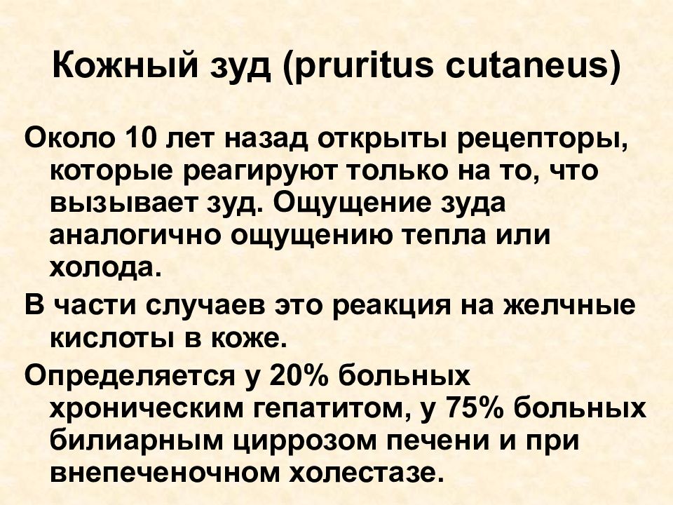 Около 10 лет назад открыты рецепторы, которые реагируют только на то, что вызывает зуд. Ощущение зуда аналогично ощущению тепла или холода. В части случаев это реакция на желчные кислоты в коже. Определяется у 20% больных хроническим гепатитом, у 75% больных билиарным циррозом печени и при внепеченочном холестазе.