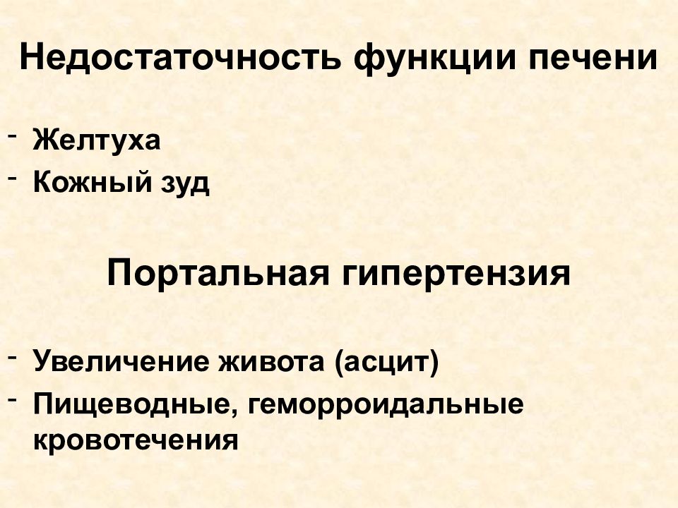 Недостаточность функции печени Желтуха Кожный зуд Портальная гипертензия Увеличение живота (асцит) Пищеводные, геморроидальные кровотечения