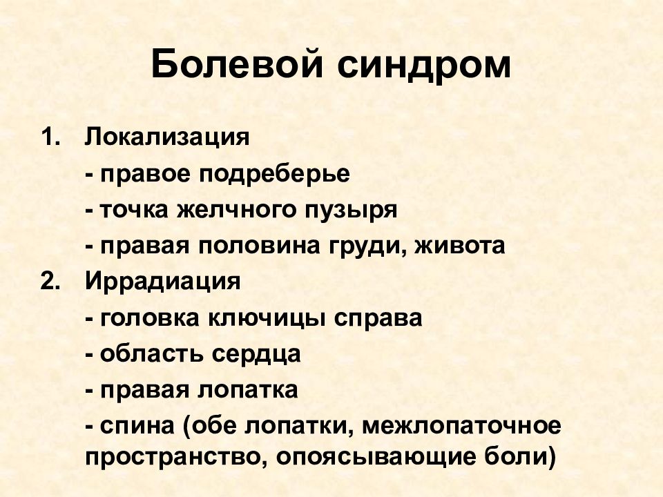 Локализация - правое подреберье - точка желчного пузыря - правая половина груди, живота Иррадиация - головка ключицы справа - область сердца - правая лопатка - спина (обе лопатки, межлопаточное пространство, опоясывающие боли)