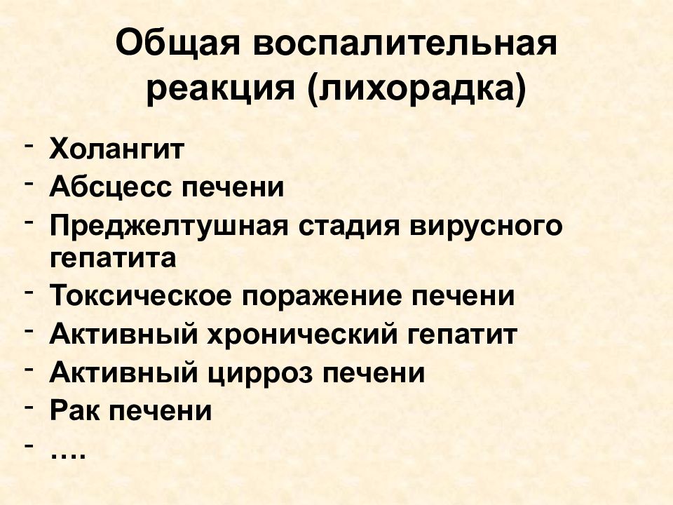 Холангит Абсцесс печени Преджелтушная стадия вирусного гепатита Токсическое поражение печени Активный хронический гепатит Активный цирроз печени Рак печени ….