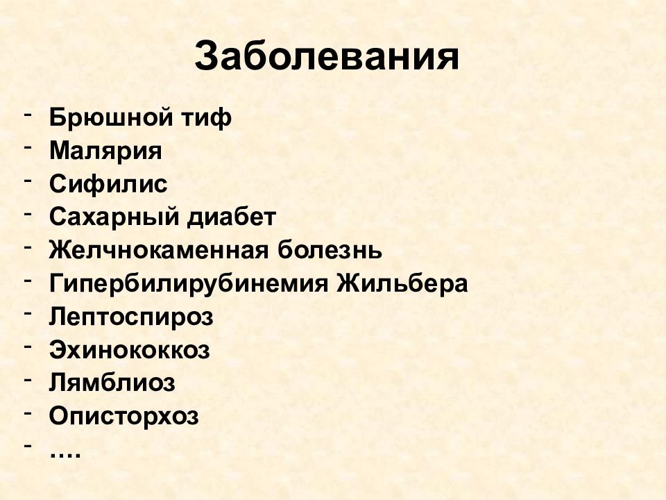 Брюшной тиф Малярия Сифилис Сахарный диабет Желчнокаменная болезнь Гипербилирубинемия Жильбера Лептоспироз Эхинококкоз Лямблиоз Описторхоз ….