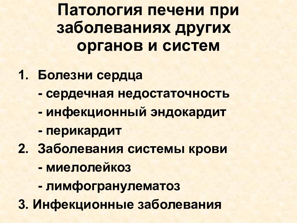 Болезни сердца - сердечная недостаточность - инфекционный эндокардит - перикардит Заболевания системы крови - миелолейкоз - лимфогранулематоз 3. Инфекционные заболевания