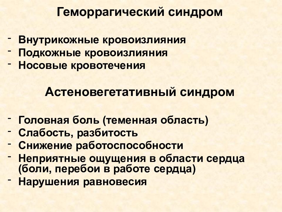 Геморрагический синдром Внутрикожные кровоизлияния Подкожные кровоизлияния Носовые кровотечения Астеновегетативный синдром Головная боль (теменная область) Слабость, разбитость Снижение работоспособности Неприятные ощущения в области сердца (боли, перебои в работе сердца) Нарушения равновесия