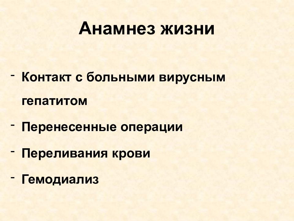 Профессия Гепатотоксические факторы Голодание Употребление алкоголя Гепатотоксические лекарства Инфекционные заболевания Эпидемиологический анамнез Наркомания