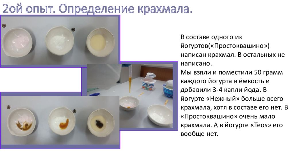 В составе одного из йогуртов(«Простоквашино») написан крахмал. В остальных не написано. Мы взяли и поместили 50 грамм каждого йогурта в ёмкость и добавили 3-4 капли йода. В йогурте «Нежный» больше всего крахмала, хотя в составе его нет. В «Простоквашино» очень мало крахмала. А в йогурте « Teos » его вообще нет.