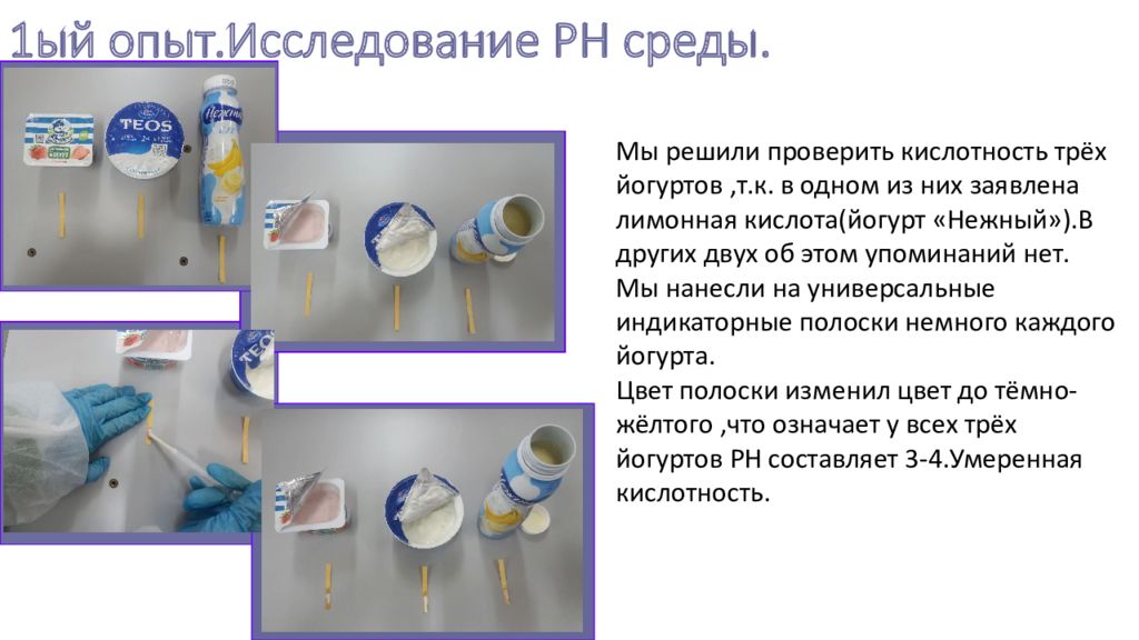 Мы решили проверить кислотность трёх йогуртов, т.к. в одном из них заявлена лимонная кислота(йогурт «Нежный»).В других двух об этом упоминаний нет. Мы нанесли на универсальные индикаторные полоски немного каждого йогурта. Цвет полоски изменил цвет до тёмно-жёлтого,что означает у всех трёх йогуртов PH составляет 3-4.Умеренная кислотность.
