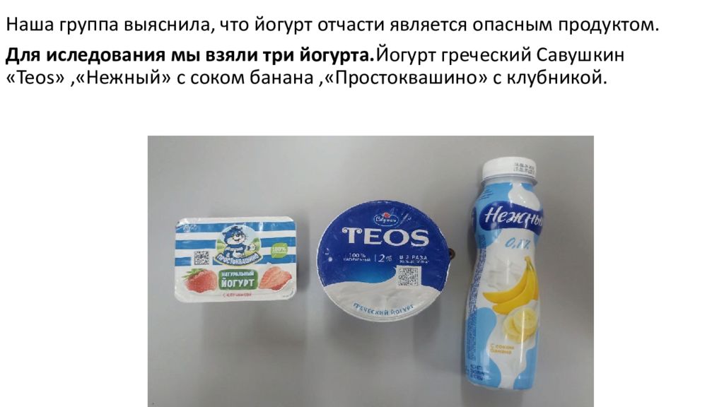 Наша группа выяснила, что йогурт отчасти является опасным продуктом. Для иследования мы взяли три йогурта. Йогурт греческий Савушкин « Teos », «Нежный » с соком банана,«Простоквашино » с клубникой.