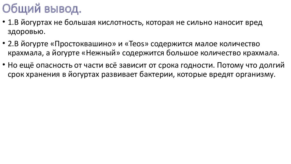 1.В йогуртах не большая кислотность, которая не сильно наносит вред здоровью. 2.В йогурте «Простоквашино» и « Teos » содержится малое количество крахмала, а йогурте «Нежный» содержится большое количество крахмала. Но ещё опасность от части всё зависит от срока годности. Потому что долгий срок хранения в йогуртах развивает бактерии, которые вредят организму.
