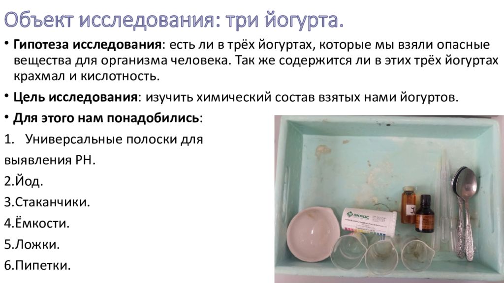 Гипотеза исследования : есть ли в трёх йогуртах, которые мы взяли опасные вещества для организма человека. Так же содержится ли в этих трёх йогуртах крахмал и кислотность. Цель исследования : изучить химический состав взятых нами йогуртов. Для этого нам понадобились : Универсальные полоски для выявления PH. 2.Йод. 3.Стаканчики. 4.Ёмкости. 5.Ложки. 6.Пипетки.