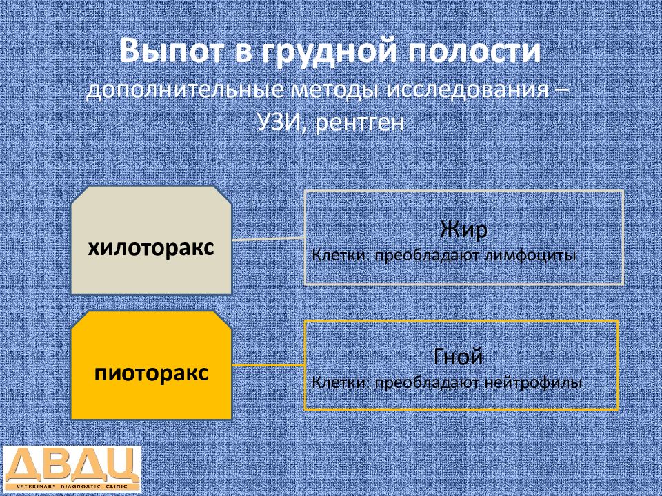 хилоторакс пиоторакс Жир Клетки: преобладают лимфоциты Гной Клетки: преобладают нейтрофилы
