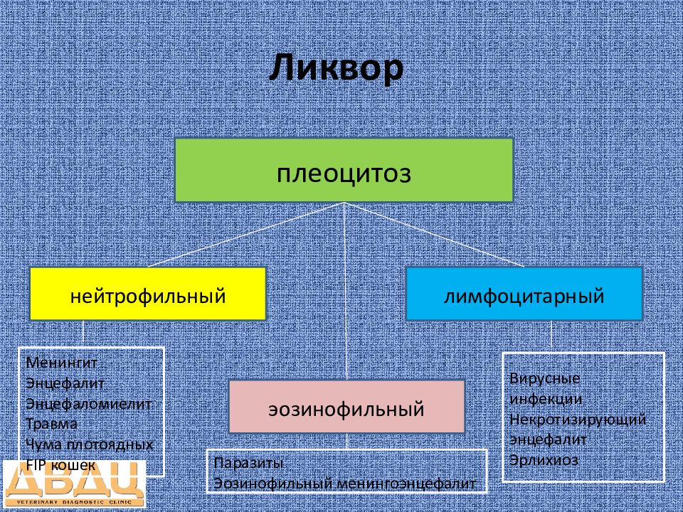 плеоцитоз нейтрофильный эозинофильный лимфоцитарный Менингит Энцефалит Энцефаломиелит Травма Чума плотоядных FIP кошек Вирусные инфекции Некротизирующий энцефалит Эрлихиоз Паразиты Эозинофильный менингоэнцефалит
