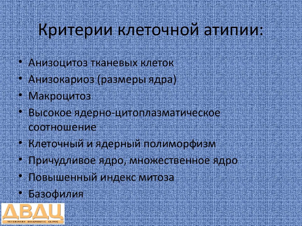 Анизоцитоз тканевых клеток Анизокариоз (размеры ядра) Макроцитоз Высокое ядерно-цитоплазматическое соотношение Клеточный и ядерный полиморфизм Причудливое ядро, множественное ядро Повышенный индекс митоза Базофилия