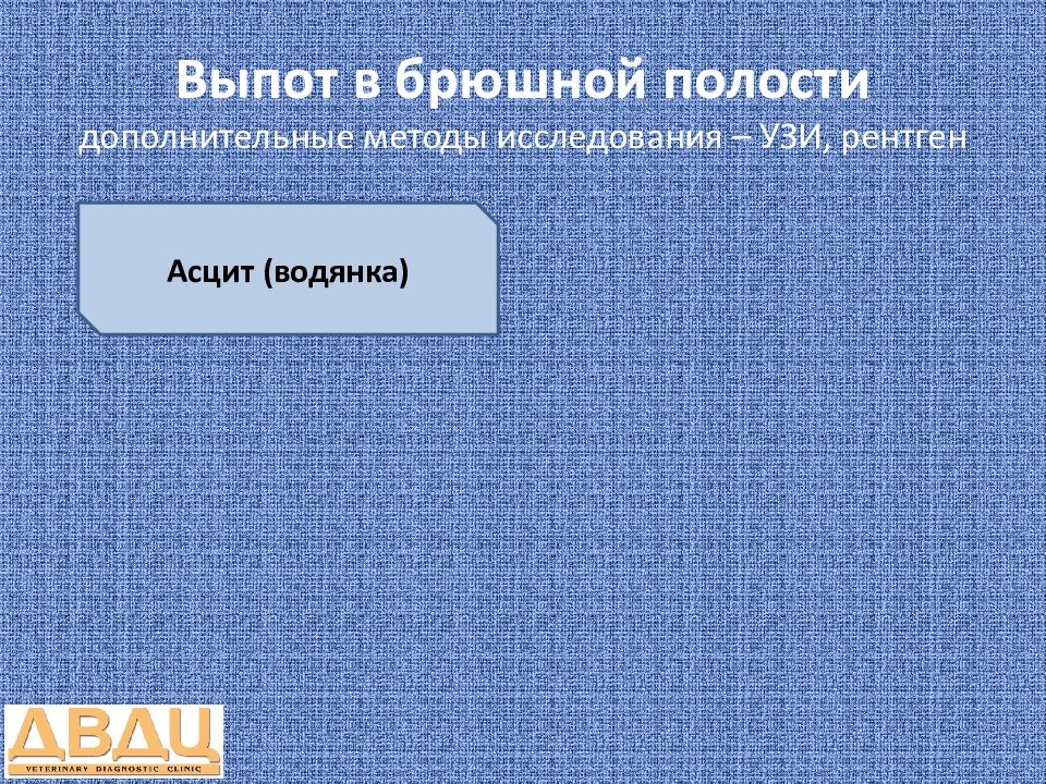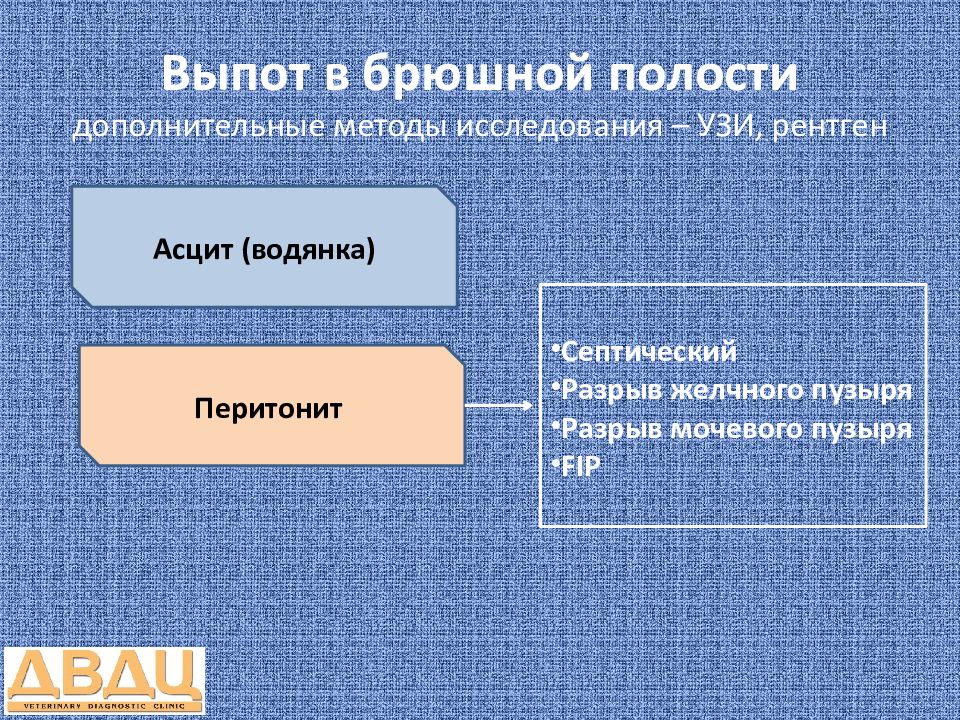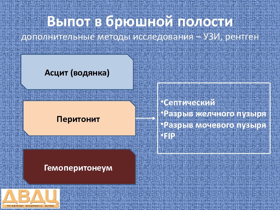 Асцит (водянка) Перитонит Гемоперитонеум Септический Разрыв желчного пузыря Разрыв мочевого пузыря FIP
