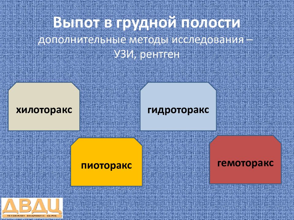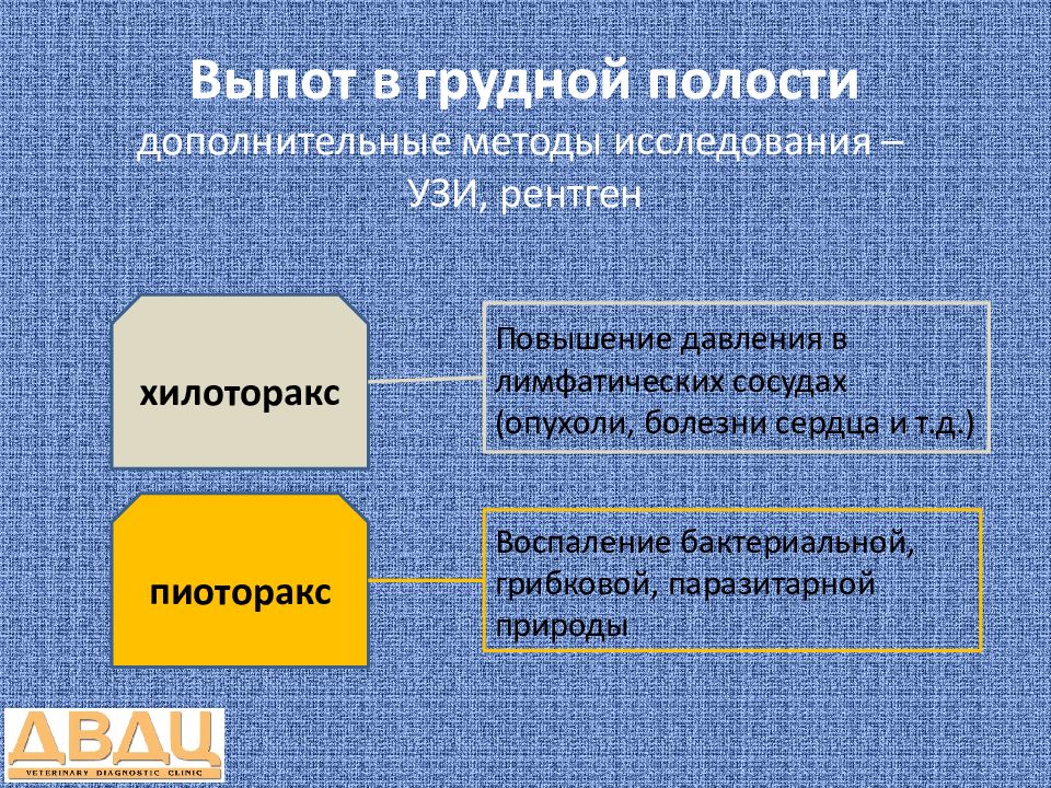 хилоторакс пиоторакс Повышение давления в лимфатических сосудах (опухоли, болезни сердца и т.д.) Воспаление бактериальной, грибковой, паразитарной природы
