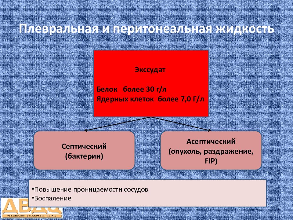 Экссудат Белок более 30 г/л Ядерных клеток более 7,0 Г/л Повышение проницаемости сосудов Воспаление Септический (бактерии) Асептический (опухоль, раздражение, FIP )