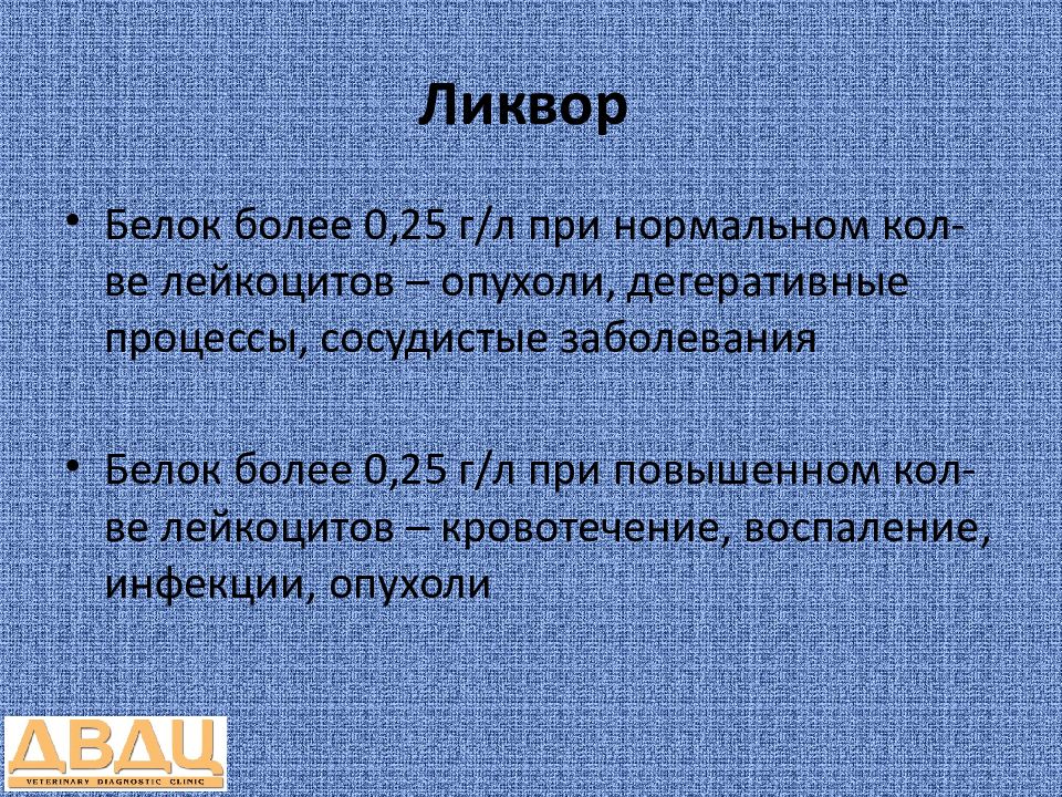 Белок более 0,25 г/л при нормальном кол-ве лейкоцитов – опухоли, дегеративные процессы, сосудистые заболевания Белок более 0,25 г/л при повышенном кол-ве лейкоцитов – кровотечение, воспаление, инфекции, опухоли