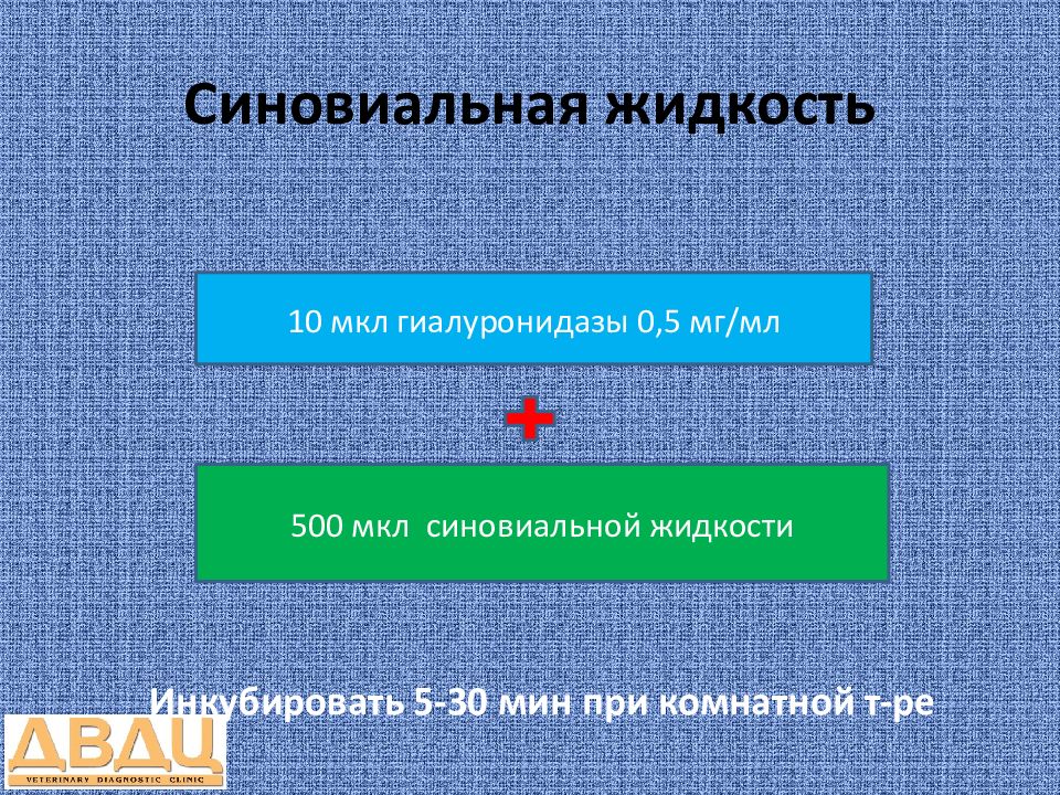 10 мкл гиалуронидазы 0,5 мг/мл 500 мкл синовиальной жидкости Инкубировать 5-30 мин при комнатной т-ре