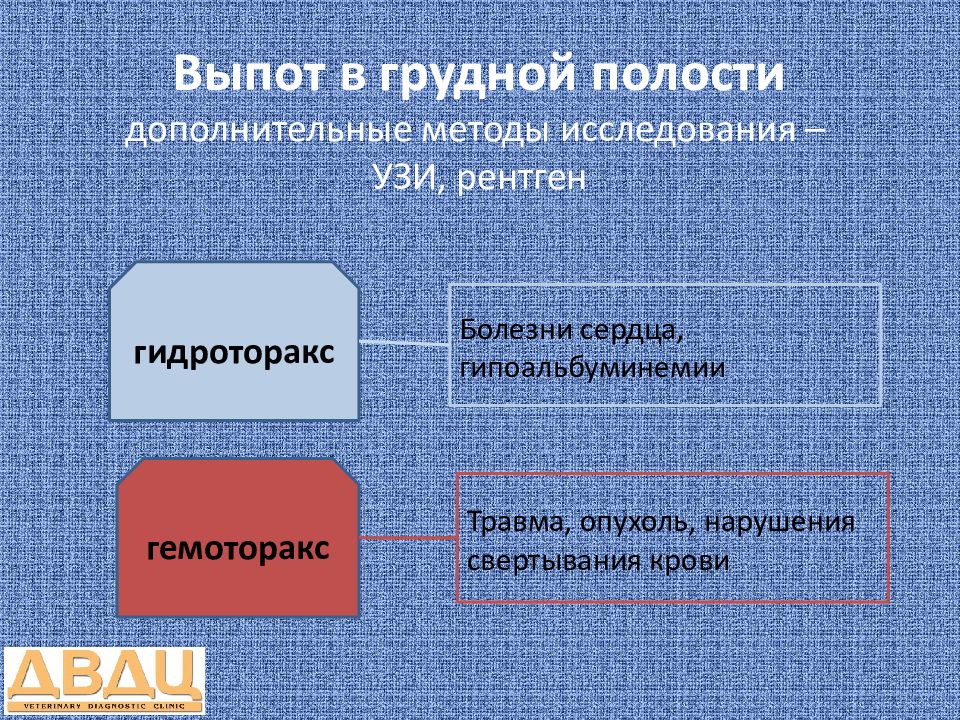 гидроторакс гемоторакс Болезни сердца, гипоальбуминемии Травма, опухоль, нарушения свертывания крови