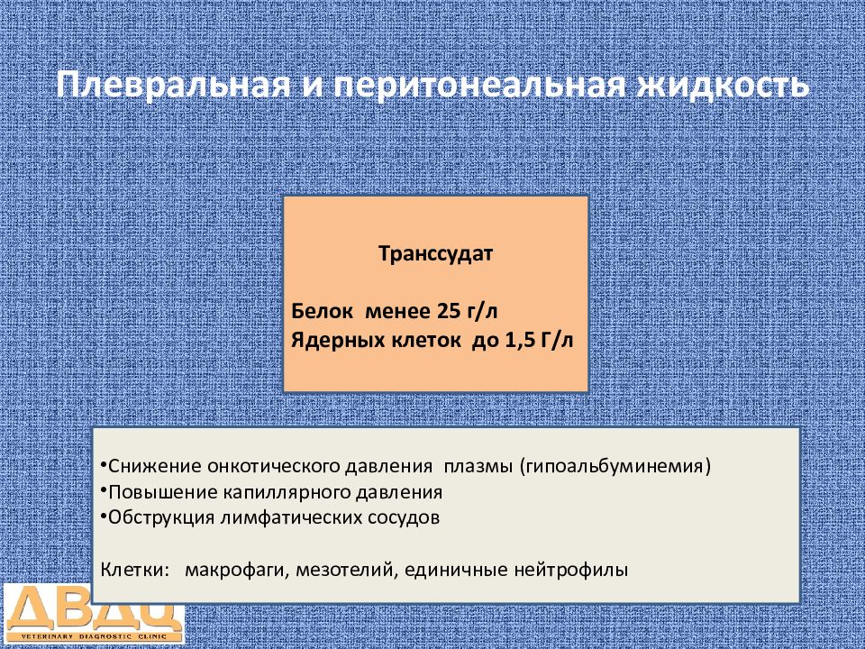 Транссудат Белок менее 25 г/л Ядерных клеток до 1,5 Г/л Снижение онкотического давления плазмы ( гипоальбуминемия ) Повышение капиллярного давления Обструкция лимфатических сосудов Клетки: макрофаги, мезотелий, единичные нейтрофилы
