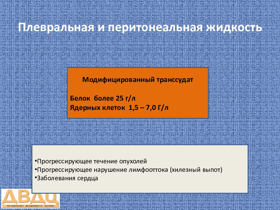 Модифицированный транссудат Белок более 25 г/л Ядерных клеток 1,5 – 7,0 Г/л Прогрессирующее течение опухолей Прогрессирующее нарушение лимфооттока ( хилезный выпот) Заболевания сердца