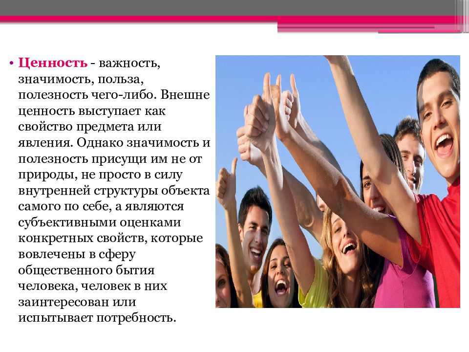 Ценность - важность, значимость, польза, полезность чего-либо. Внешне ценность выступает как свойство предмета или явления. Однако значимость и полезность присущи им не от природы, не просто в силу внутренней структуры объекта самого по себе, а являются субъективными оценками конкретных свойств, которые вовлечены в сферу общественного бытия человека, человек в них заинтересован или испытывает потребность.