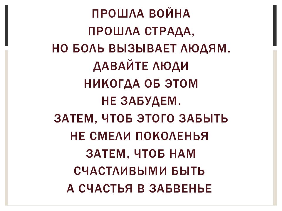 ПРОШЛА ВОЙНА ПРОШЛА СТРАДА, НО БОЛЬ ВЫЗЫВАЕТ ЛЮДЯМ. ДАВАЙТЕ ЛЮДИ НИКОГДА ОБ ЭТОМ НЕ ЗАБУДЕМ. ЗАТЕМ, ЧТОБ ЭТОГО ЗАБЫТЬ НЕ СМЕЛИ ПОКОЛЕНЬЯ ЗАТЕМ, ЧТОБ НАМ СЧАСТЛИВЫМИ БЫТЬ А СЧАСТЬЯ В ЗАБВЕНЬЕ