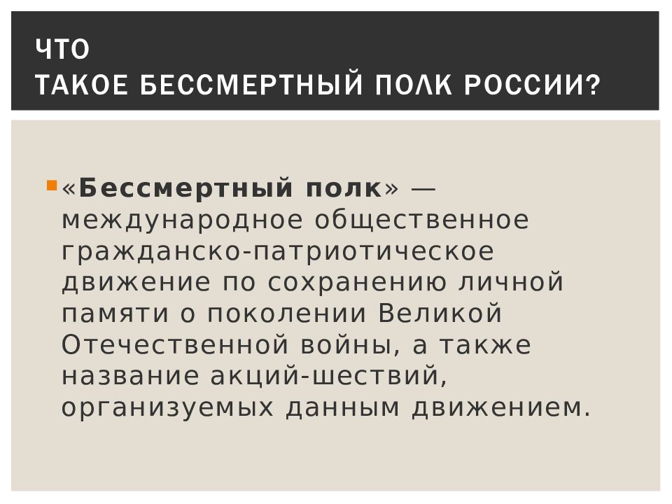 « Бессмертный полк » — международное общественное гражданско-патриотическое движение по сохранению личной памяти о поколении Великой Отечественной войны, а также название акций-шествий, организуемых данным движением. Что такое Бессмертный полк России?