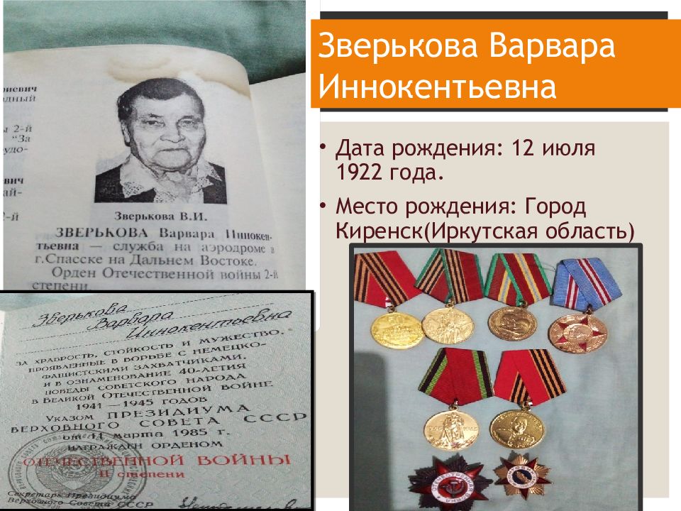 Зверькова Варвара Иннокентьевна Дата рождения: 12 июля 1922 года. Место рождения : Город Киренск(Иркутская область)