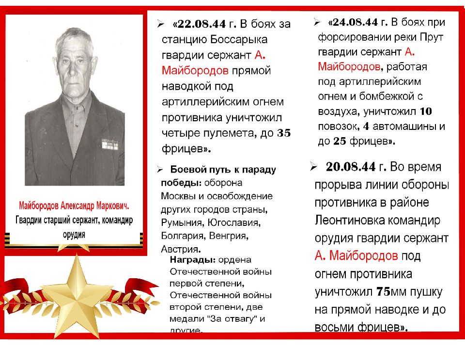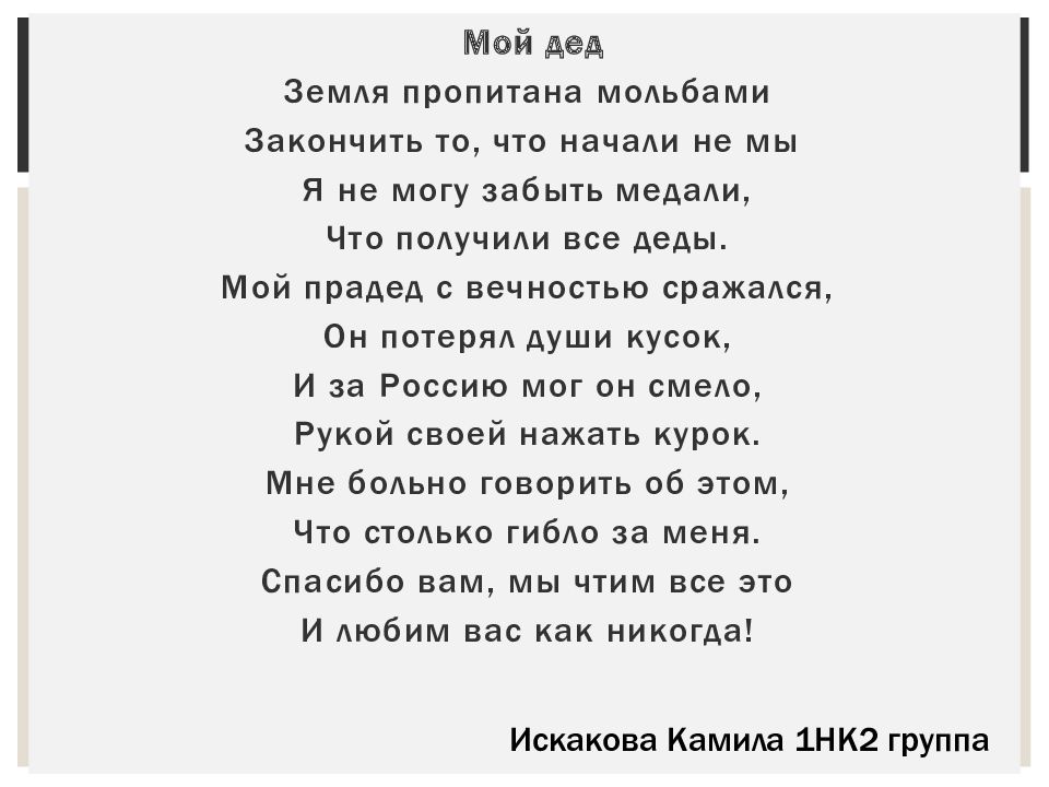 Мой дед Земля пропитана мольбами Закончить то, что начали не мы Я не могу забыть медали, Что получили все деды. Мой прадед с вечностью сражался, Он потерял души кусок, И за Россию мог он смело, Рукой своей нажать курок. Мне больно говорить об этом, Что столько гибло за меня. Спасибо вам, мы чтим все это И любим вас как никогда! Искакова Камила 1НК2 группа
