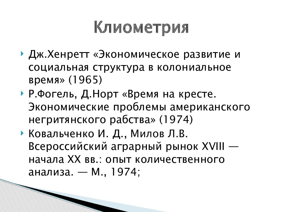 Дж.Хенретт «Экономическое развитие и социальная структура в колониальное время» (1965) Р.Фогель, Д.Норт «Время на кресте. Экономические проблемы американского негритянского рабства» (1974) Ковальченко И. Д., Милов Л.В. Всероссийский аграрный рынок XVIII — начала XX вв.: опыт количественного анализа. — М., 1974; Клиометрия
