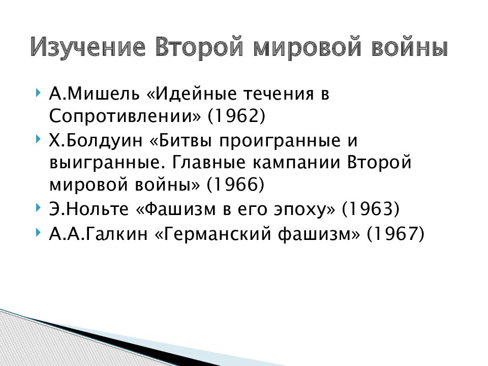 А.Мишель «Идейные течения в Сопротивлении» (1962) Х.Болдуин «Битвы проигранные и выигранные. Главные кампании Второй мировой войны» (1966) Э.Нольте «Фашизм в его эпоху» (1963) А.А.Галкин «Германский фашизм» (1967) Изучение Второй мировой войны