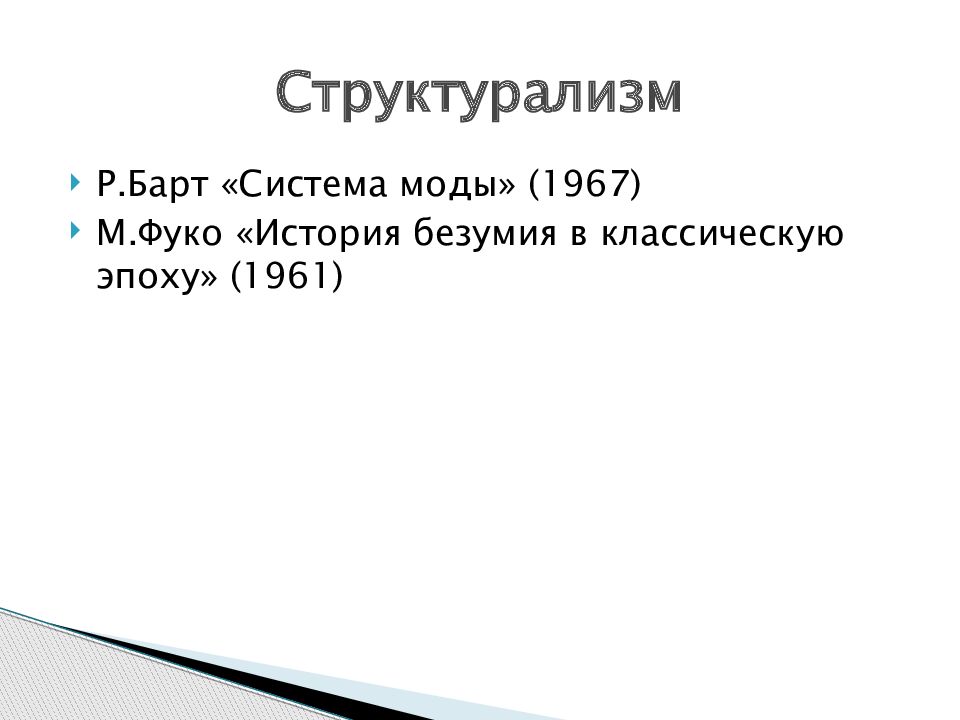 Р.Барт «Система моды» (1967) М.Фуко «История безумия в классическую эпоху» (1961) С труктурализм